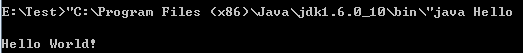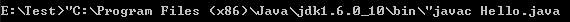 其中双引号引起来的是本机的 jdk 安装路径,javac 是编译 Hello.java 文件的指令,运行上面的指令之后会在 E:Test 的目录下生成 Hello.class 文件,接着使用下面的命令运行 .class 文件,并输出结果: